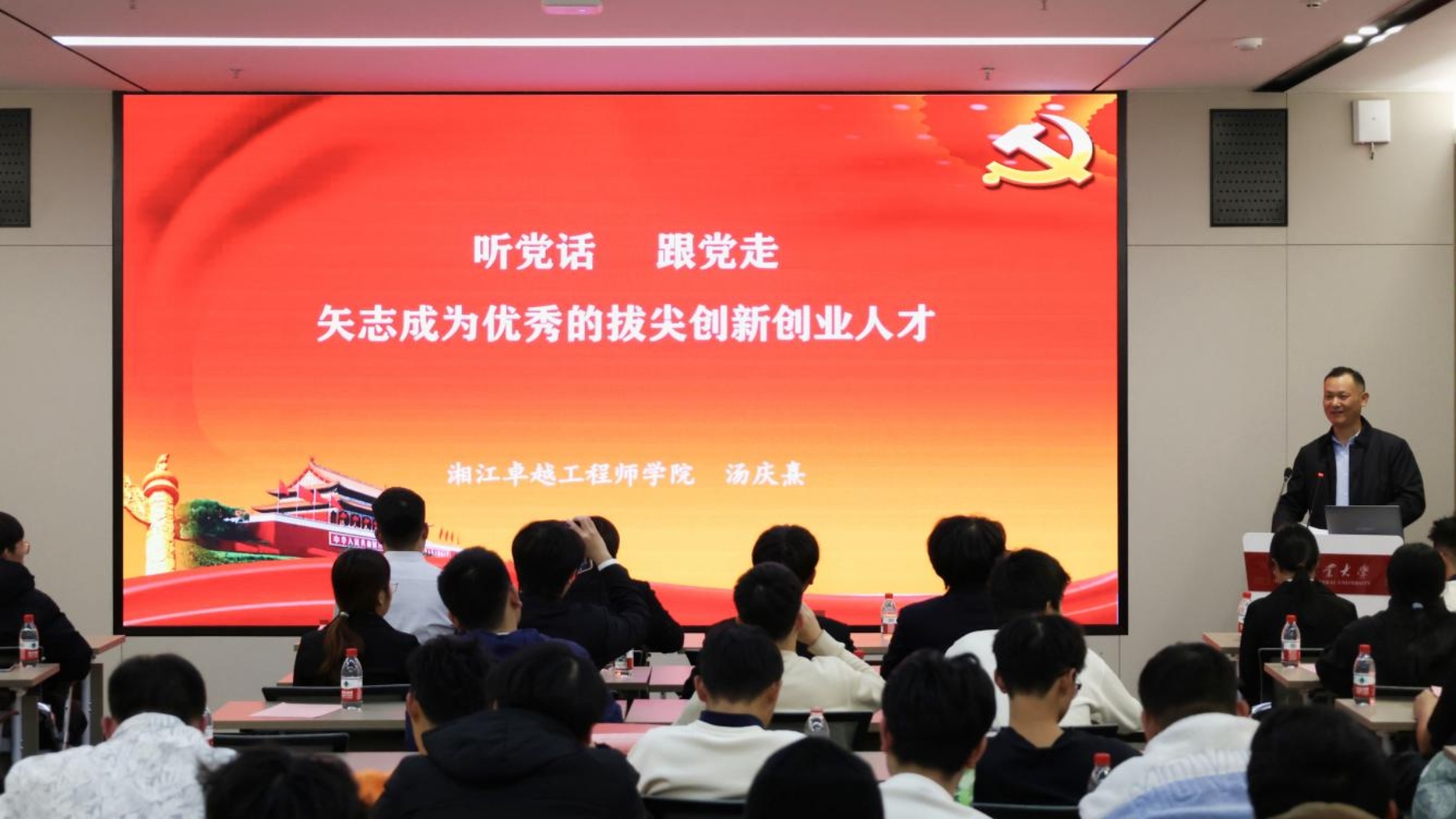 汤庆熹聚焦“习近平总书记期待我们成为什么样的人?”和“我们怎样成为习近平总书记心中优秀的青年?”两个核心问题,讲授了“跟党走 听党话 矢志成为优秀的拔尖创新创业人才”主题团课。他强调全体大学生要深入学习、深刻领会、深度践行习近平总书记对青年大学生的殷切嘱托和谆谆教诲,希望同学们坚定理想信念、厚植家国情怀、锤炼能力本领、自觉责任担当,在“坚持胸怀国之大者、坚持常为感恩之行、坚持保有快乐之心、坚持走好奋斗之路”“立场鲜明讲求政治、幸福共进讲求团结、上下求索讲求方法、把住底线讲求平安”“拥有大格局、拥有大情怀、拥有高智商、拥有高情商”的“四坚持四讲求四拥有”中发展好自己、成就好未来,努力成长为有理想、敢担当、能吃苦、肯奋斗的新时代青年。