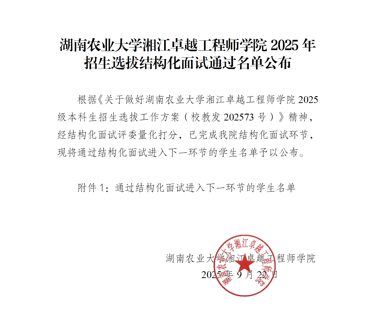湖南农业大学湘江卓越工程师学院2025年招生选拔结构化面试通过名单公布