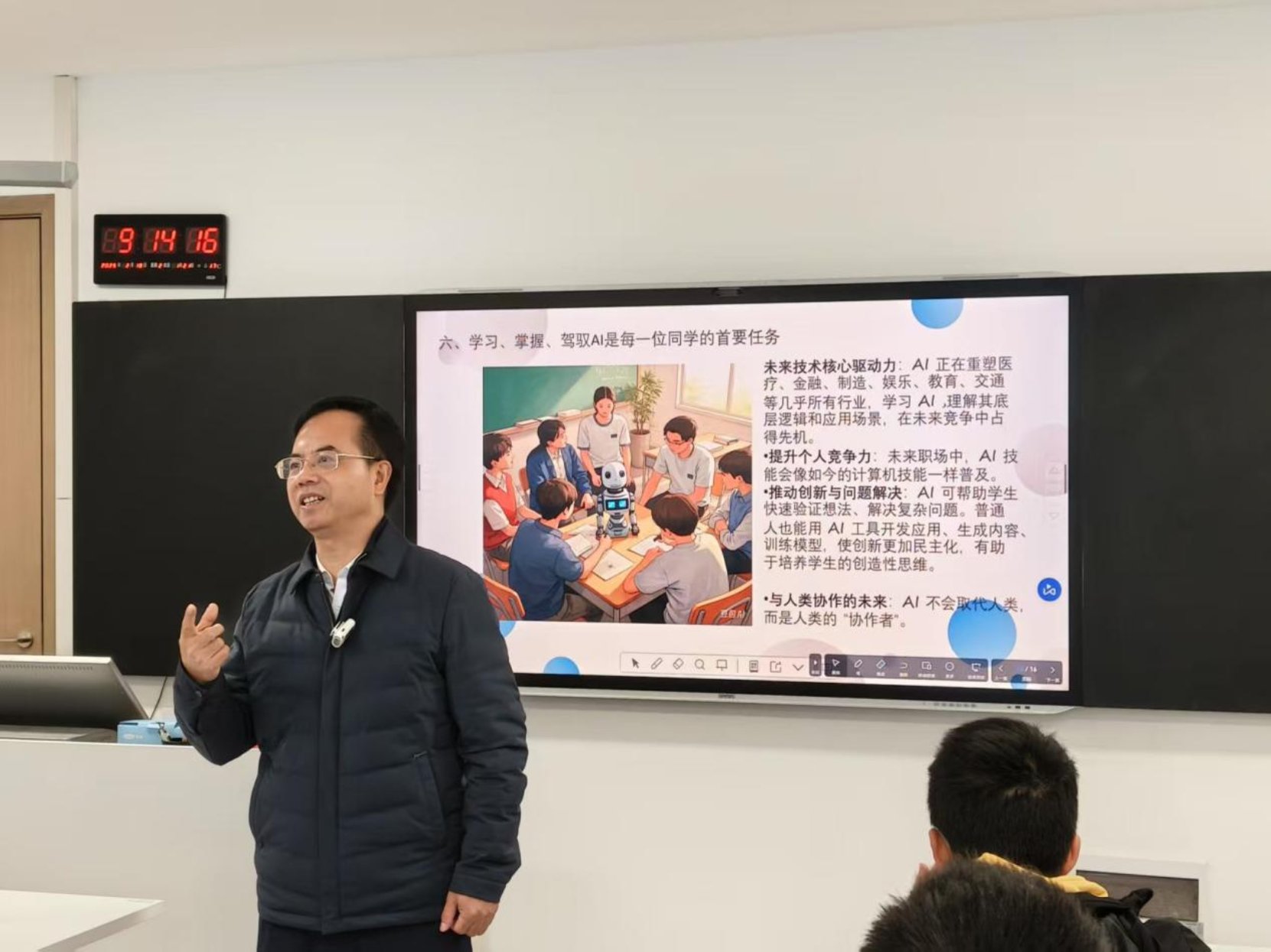 针对人工智能的快速发展,陈弘分享了自己对AI运用的见解。他提醒同学们要理性看待AI,积极学习掌握AI技术,将其作为工具,而不是被AI所奴役。学习、掌握驾驭AI是每一位同学的首要任务。