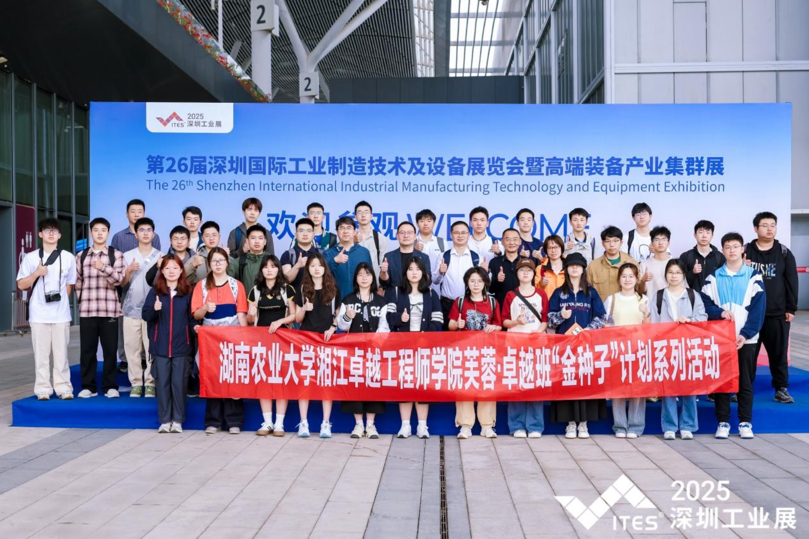 湖南农业大学湘江卓越工程师24级“芙蓉·卓越”班30名学子与10名骨干教师,在周智院长的带领下奔赴深圳,开启以“拓展科技视野,探索行业前沿”为主题的研学实践。首日师生团队走进2025 ITES深圳工业展,通过沉浸式调研与创新实践,近距离触摸智能制造脉搏,感受科技与产业深度融合的澎湃浪潮。