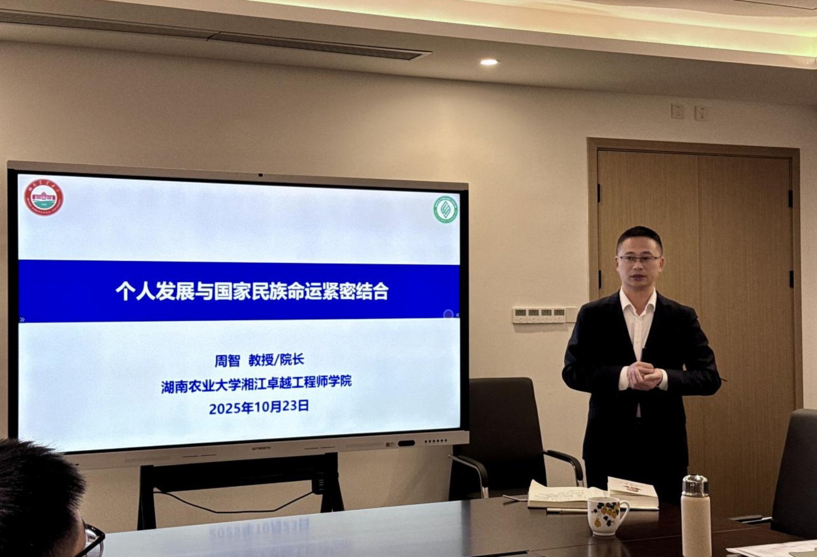 学院院长周智以“个人发展与国家民族命运紧密结合”为题讲授专题党课。他围绕《习近平谈治国理政(第五卷)》学习体会,结合自身求学、科研与工作经历,系统阐释了个人成长与国家发展、民族复兴的内在联系;从“个人发展是什么”“国家民族命运是什么”“‘三农’工作的重要性”“教育科技人才一体化”“如何实现紧密联系”五个方面展开论述;指出:在推进中国式现代化进程中,每一位教师都应自觉将个人理想融入国家发展大局,特别是在农业强国建设、乡村振兴、科技自立自强等关键领域主动担当、积极作为;强调:学院要聚集国家战略需求和“三农”问题,持续深化教学改革,加强创新创业教育,推动课程体系与产业需求对接,推动教育、科技、人才一体化发展,培养更多知农爱农、强农兴农的卓越人才,助力地方产业升级和区域高质量发展。